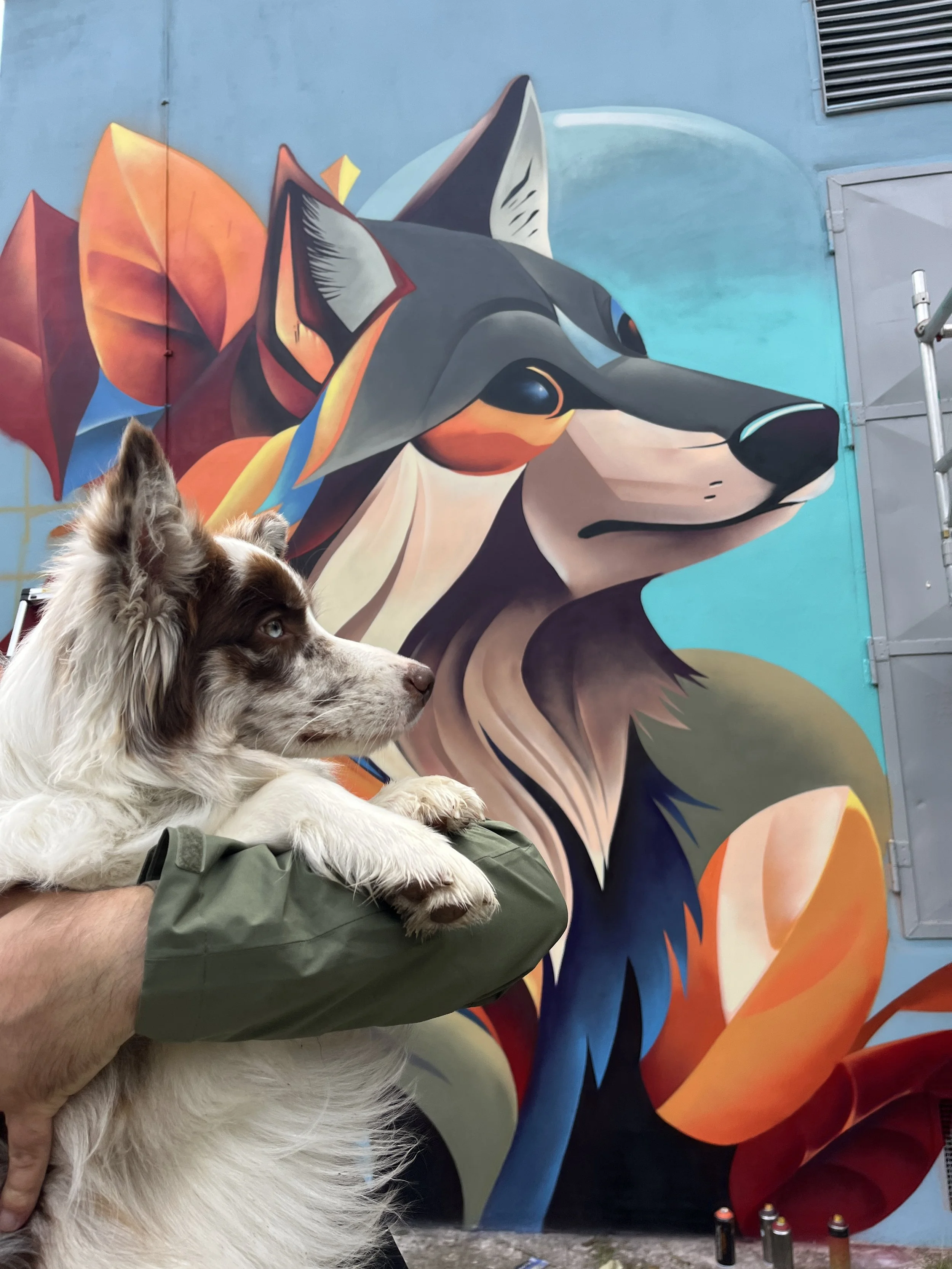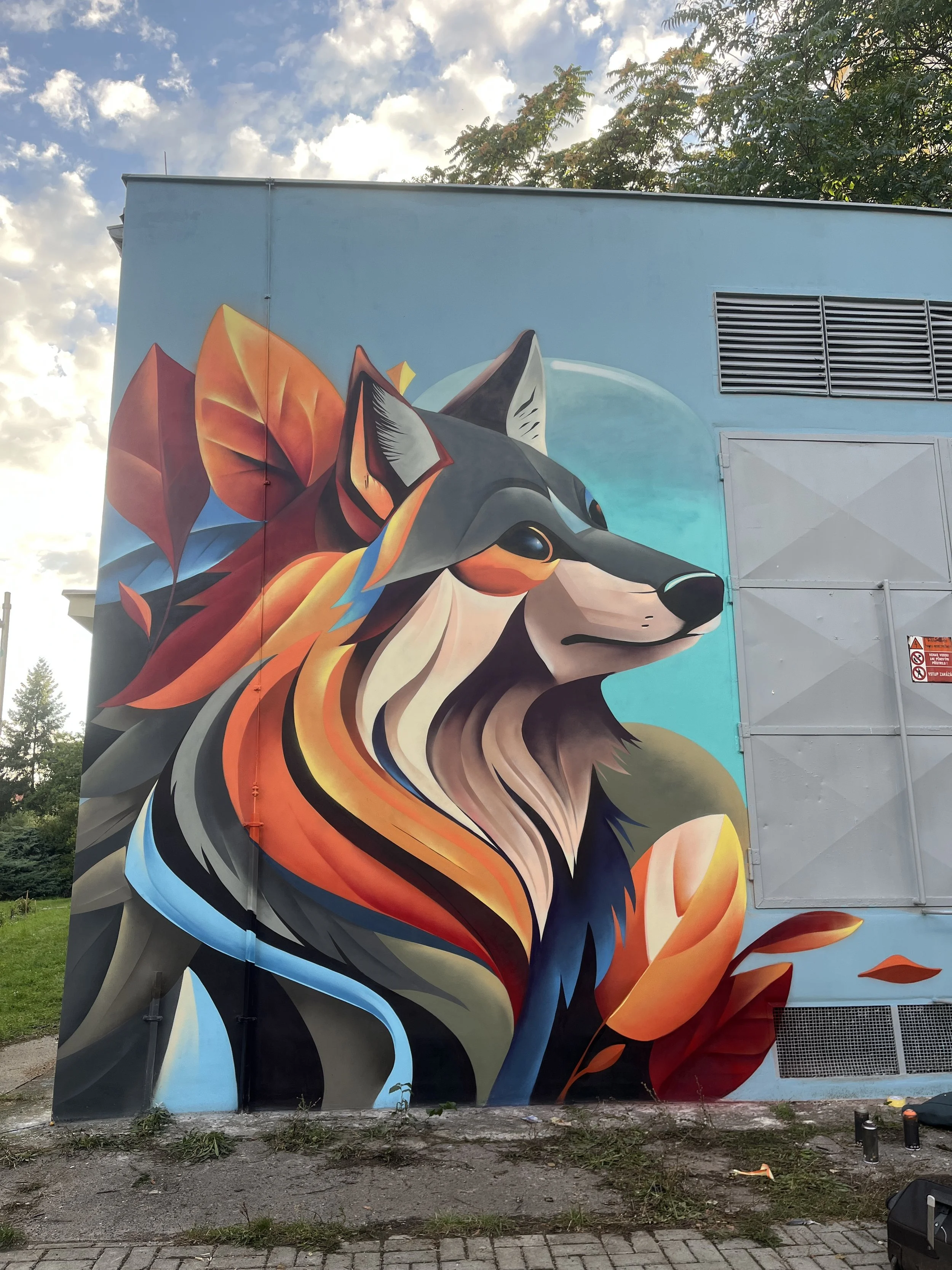 We created this wall mural of a wolf in autumn colors for a Czech electricity supplier. While we had a vector visualization for the design, we had almost complete freedom in terms of colors and execution. The brief was to make the spray painting look “appealing.”.