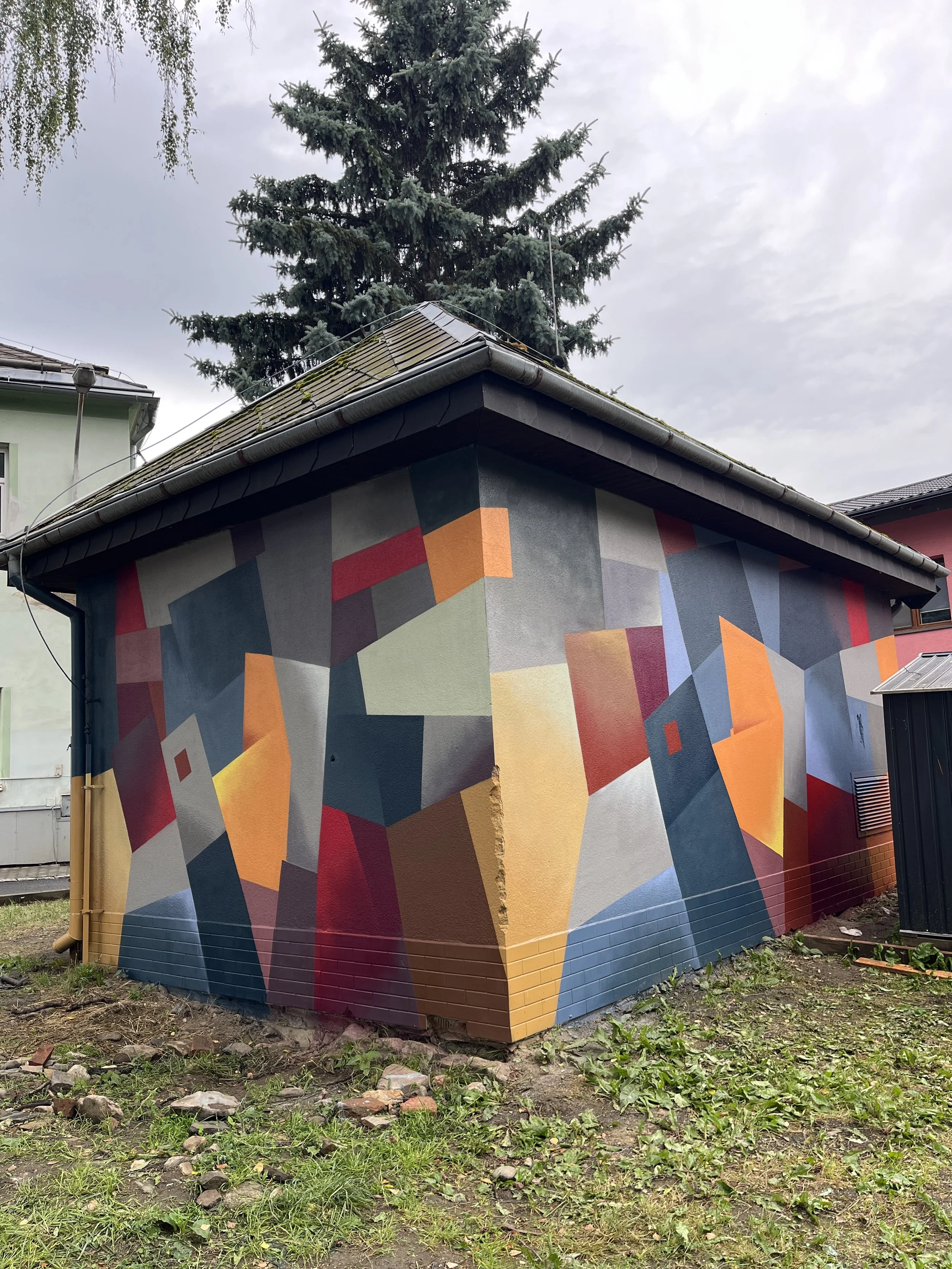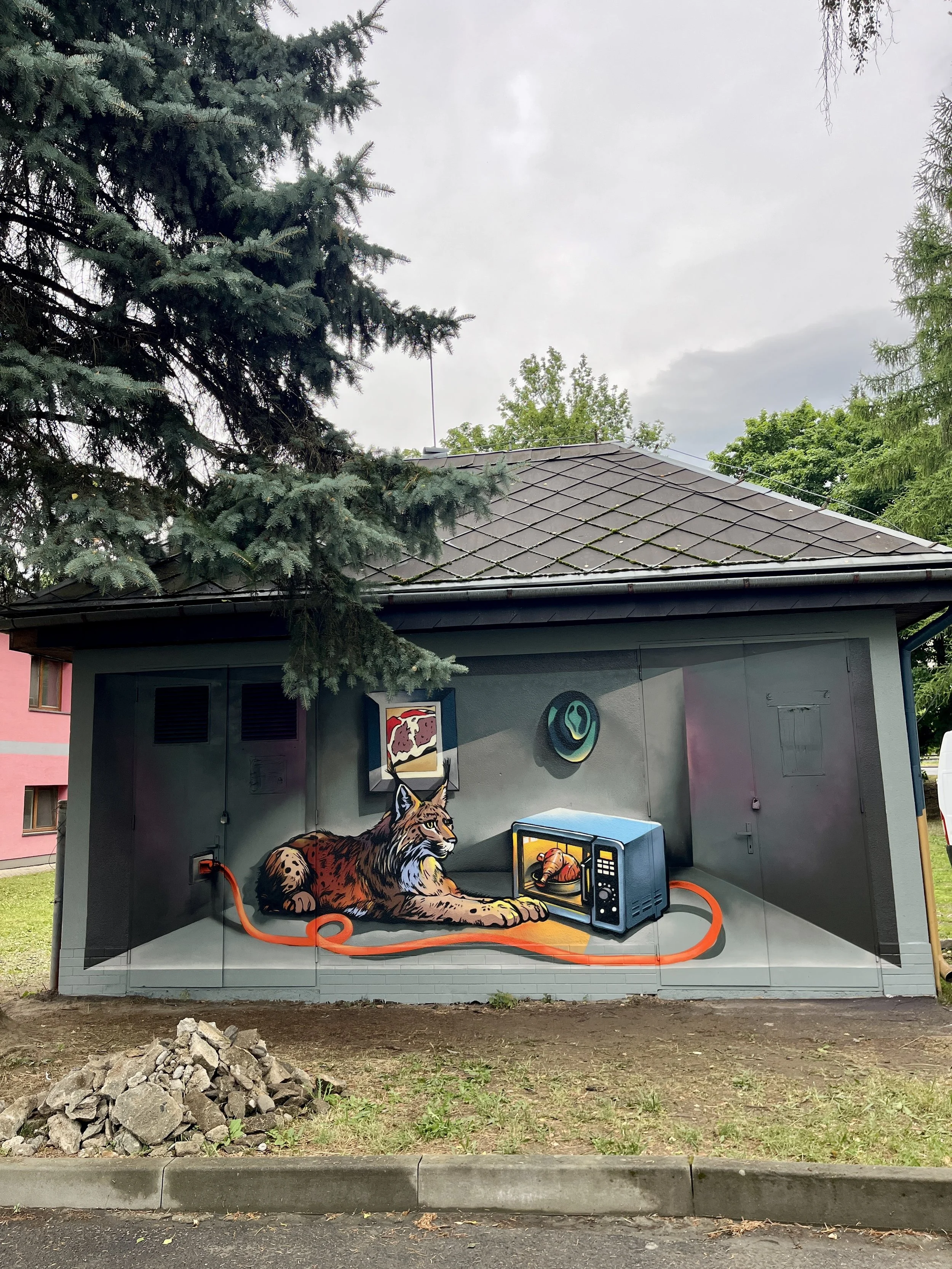 For this project, we were approached to paint the buildings of electrical transformer stations for a Czech electricity supplier. Based on designs with the theme of electrification, we created spatial mural paintings. In this case, we painted an illustration of a lynx with a microwave oven :-)
