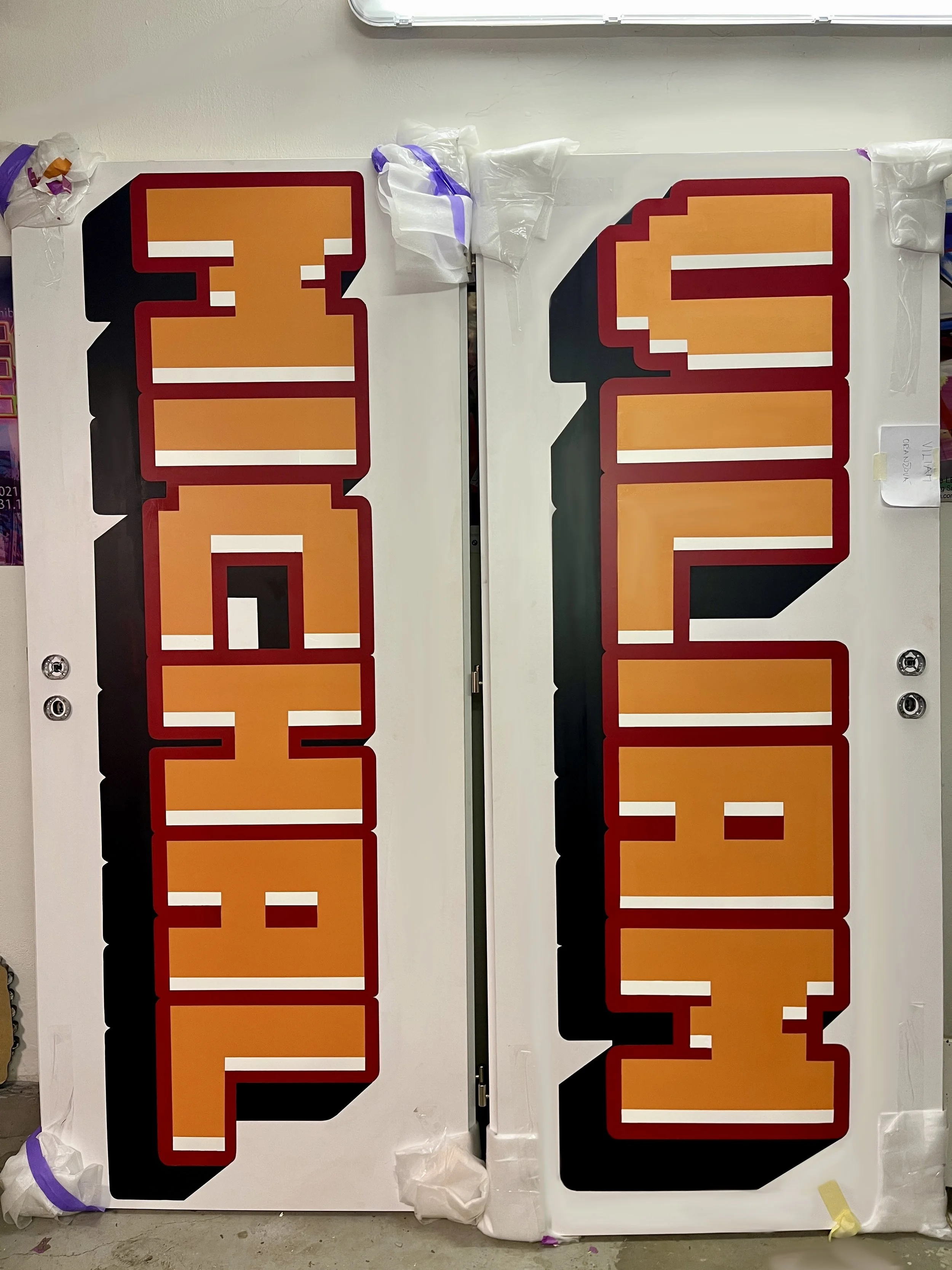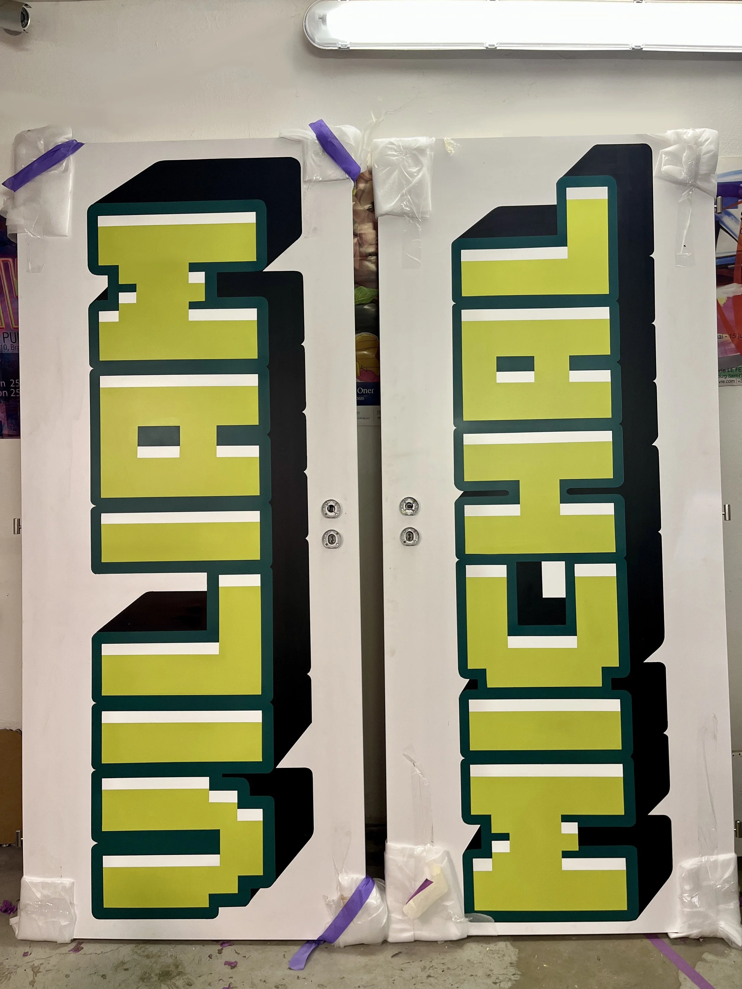 Minecraft theme- Hand-painted mural on children’s room doors. Custom design with the child’s name, bold colors, and a unique style that transforms kids room space.